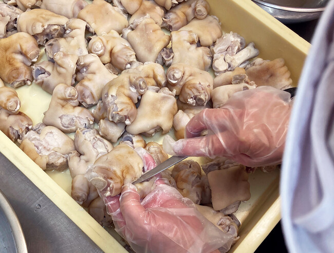 ■機械ではできない細やかな手仕事ボイル後、一旦冷やすとお肉がぎゅっと引き締まり、剃り残した毛が出現。ひとつひとつ手触りで、探りながら取り除いていきます。
