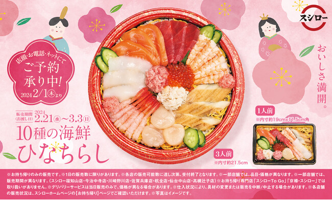 株式会社あきんどスシロー(本社:大阪府吹田市、代表取締役社長:新居 耕平)は、ひな祭を華やかに彩る「10種の海鮮ひなちらし」を、2月21日(水)~3月3日(日)の期間限定で全国のスシローにて販売いたします。