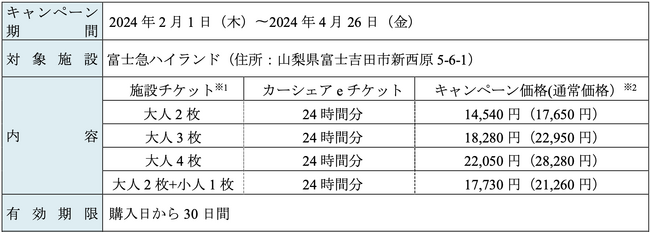 タイムズモビリティ株式会社(本社:東京都品川区、社長:川上紀文)は、2月1日より、富士急ハイランド(所在地:山梨県富士吉田市)の施設チケットとカーシェアリングサービス「タイムズカー」の電子優待券(カーシェアeチケット)を優待価格で販売する「お出かけeクーポン」をオトクに購入いただけるキャンペーンを実施します。