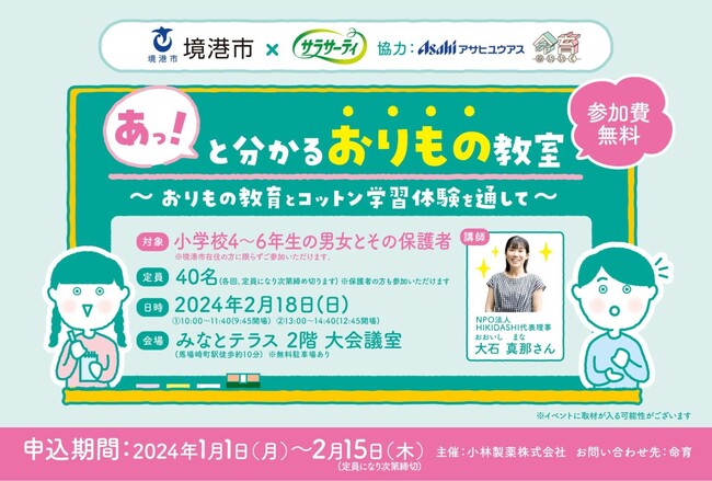 その一環として2月18日に境港市内で「あっ!と分かるおりもの教室」が開催されます。対象は小学校4年生~6年生の男女で、思春期のからだとおりものについての講義や、コットンについての体験学習が予定されています。