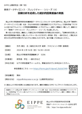 【岡山大学】EIPPE公開研究会(第7回)「教育データサイエンス・プレレクチャー・シリーズ(4)回帰分析を応用した統計的因果推論の実践〔2/16,金 岡山大学津島キャンパス〕