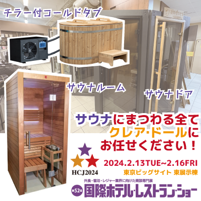 【ハルビア千葉船橋ショールーム】を運営するHARVIA OFFICIAL SAUNA DEALER(地域特約店)の株式会社クレア・ドール(本社:千葉県船橋市、代表取締役:清藤寿幸)は、2024年2月13日(火)・14日(水)・15日(木)・16日(金)に東京ビッグサイトにて開催される第52回国際ホテル・レストラン・ショーにて、世界サウナシェアNo.1HARVIA製のヒーター&サウナルームや、常に冷たい!チラー付き1人用コールドタブ、andres社のサウナ用ドアを展示致します!