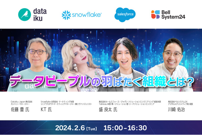 株式会社ベルシステム24(本社:東京都港区、代表取締役 社長執行役員:野田 俊介、以下:当社)は、データビジネスにおける先進企業である株式会社セールスフォース・ジャパンおよびSnowflake合同会社、Dataiku Japan株式会社の3社をゲストに迎え、データやAI活用を加速するためのトレンド情報や今後の組織作りのヒントをお届けする「データピープルの羽ばたく組織とは?」と題したオンラインセミナーを、2月6日(火)に開催します。