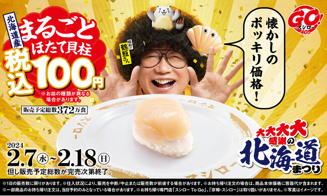 2月7日(水)からは、北海道の食材や北海道ならではの商品を集めた『大大大大感謝の北海道まつり』を開催いたします。目玉商品は、40周年の記念商品としてご提供する「北海道産まるごとほたて貝柱 100円」です。“うまいすし”を少しでもお手頃にお腹いっぱい召し上がっていただきたい、という想いから、濃厚でコクのある甘みと旨みが味わえるほたて貝柱を、価格帯が異なる都市型店舗・準都市型店舗・郊外型店舗で全店“税込100円”で販売いたします。