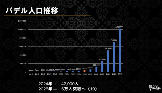 「JPA AWARDS 2023」後半の第2部では、日本パデル協会 事業部の活動報告を日本パデル協会 副会長の玉井勝善より行いました。2024年、日本のパデル人口は42,000人を見込んでいることや、2024年にオープンが予定されているパデル施設、そして広報活動などについて発表しました。2025年のパデル人口は6万人を見込んでおり、2026年までには10万人を目指して日々活動を実施しています。