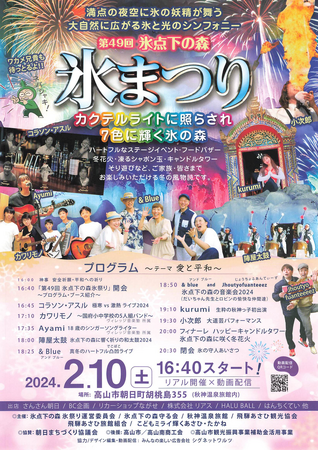 令和6年2月10日(土)に開催される、今年で49回目を迎える氷まつりは、ハートフルなステージイベント、フードバザー、冬花火、凍るシャボン玉、キャンドルタワー、そり遊びなど、ご家族皆様でお楽しみいただける冬の風物詩です。全て有志の協力で構成されており、地元の協力者とボランティアスタッフが会場を盛り上げます。
