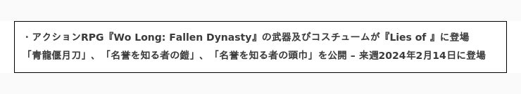 株式会社NEOWIZ (本社:韓国 京畿道城南市、共同代表:金 承徹(キム・スンチョル)/裵 泰根(ベ・テグン)) は2023年9月19日(月)に発売いたしましたソウルライクアクションRPG『Lies of P』におきまして、アクションRPG 『Wo Long: Fallen Dynasty(以下、Wo Long)』とのコラボ内容を本日公開いたしました。