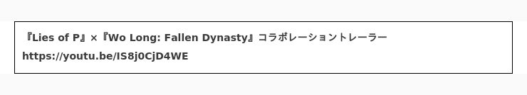 両タイトルのコラボのお知らせを『Lies of P』公式YouTubeチャンネル(https://youtu.be/IS8j0CjD4WE)にて公開いたしました。動画には飛び回る龍や青く光る『Lies of P』の主人公の心臓のように2つのタイトルの世界観が混ざり合うような演出が盛り込まれています。