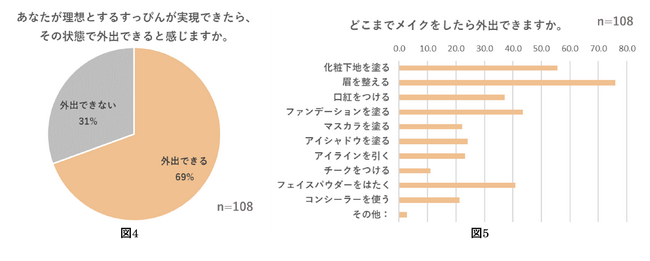 また、ノーメイクで外出できないと回答した108名のうち69%の人が、今気になっているすっぴん悩みを隠すことができる「理想のすっぴん」を実現できたら外出できると回答しました。(図4)具体的にどこまでメイクをしたら外出できるかに関しては、1位「眉を整える(75%)」、2位「化粧下地を塗る(55.6%)」、3位「フェイスパウダーをはたく(40.7%)」という結果になりました。現実のすっぴんとは違う「理想のすっぴん」は、お肌のみならず、眉毛や唇が整っている状態でもあるようです。