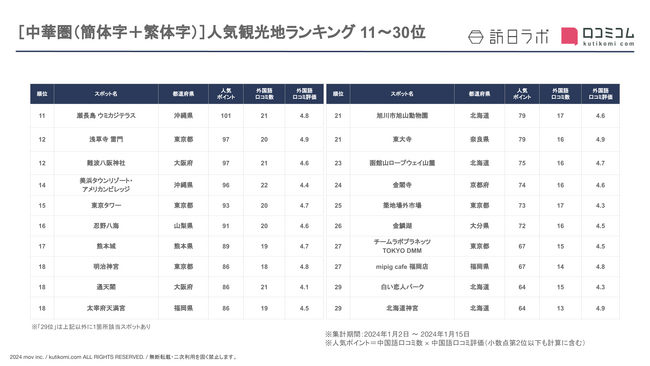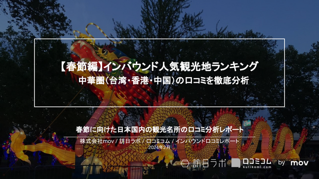 国内最大級のインバウンド総合メディア「訪日ラボ」及び 口コミサイトを”もっと”売上に変える店舗支援SaaS「口コミコム」を運営する株式会社mov(代表取締役:渡邊 誠、本社:東京都渋谷区、以下mov)は、全国の観光スポットに寄せられた最新の口コミデータから、独自の『中華圏に人気の観光スポットランキング』を発表しました。