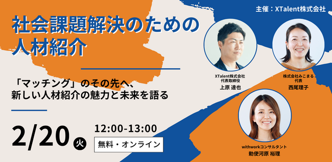 ・ 社会課題を解決する人材紹介とは・ 人材紹介が社会に変化を与えた事例・「社会課題解決×人材紹介」をサステナブルに実現する方法・ XTalentが解決しようとする課題とはなどなど、「より社会貢献性の高い人材紹介」を目指す人は必見の内容となっています。XTalentがサステナブルにwithworkを運営する秘密も一部公開しますので、ぜひ奮ってご参加ください。お申し込みフォームから登壇者への質問・疑問も募集しておりますので、どしどしお寄せください。(当日も質問可)