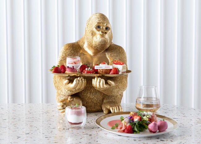 KAREのオリジナリティー溢れるインテリアで装飾された店内では、ゴリラ、ブルドッグ、クマといったKAREのバトラーシリーズを代表する動物たちが、苺のスイーツやセイヴォリーを、可愛らしいティースタンドとなって提供してくれるストロベリー・アフタヌーンティーがお楽しみいただけます。その他、カモミールやエルダーフラワーといったフローラルを感じるパフェや、マスカルポーネにベリーを合わせたミルフィーユなどもご用意。また、アフタヌーンティーをご注文の方には、KAREの人気雑貨が当たるガチャにもご挑戦いただけます。