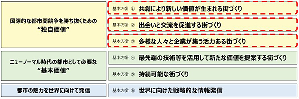■本取組は、梅田ビジョンに掲げる6つの基本方針のうち、(1)・(2)・(3)の街づくりを目指しています。