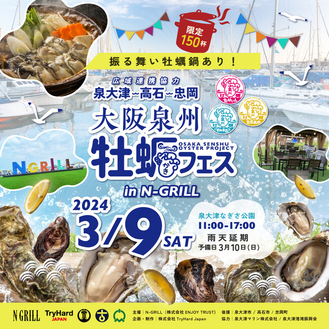 関西を中心に多数の人気イベントを手掛ける株式会社TryHard Japan(本社:大阪市中央区)と、クリエイティブな事業を展開する株式会社ENJOY TRUST(本社:大阪市中央区)が、官民連携で運営するシーサイドバーベキュー施設「NGRILL」(所在地:大阪府泉大津市)にて「大阪泉州牡蠣フェスinNGRILL」を2024年3月9日(土)に共同開催することを決定いたしました。