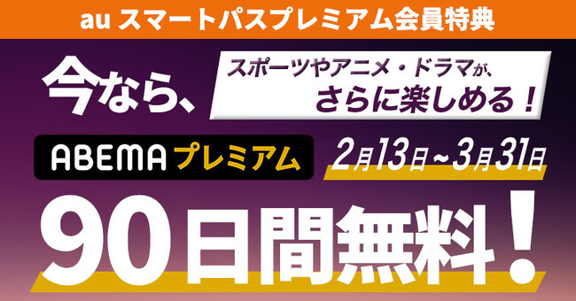 この度、2024年2月13日から2024年3月31日までの期間、スポーツやアニメ・ドラマが、いつでも楽しめる新しい未来のテレビ「ABEMA」の有料プラン「ABEMAプレミアム(960円/月)」について、初回2週間で提供している無料特典期間を拡張し、新規加入者に限り約3カ月(90日間)無料となるクーポンを、 auスマートパスプレミアム会員限定で配布します。