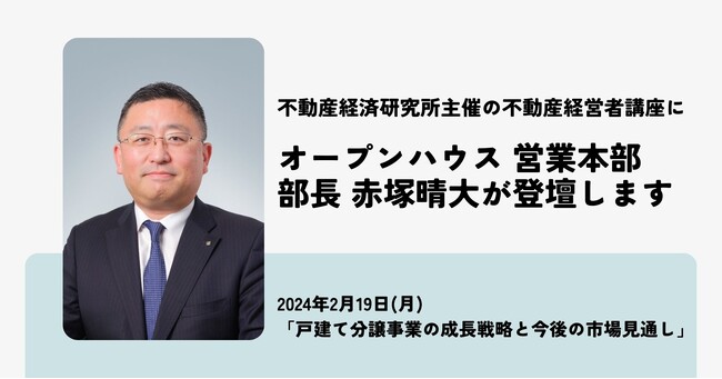 株式会社オープンハウスグループ(本社 東京都千代田区、代表取締役社長 荒井正昭、以下「当社」)のグループ会社である株式会社オープンハウス(以下、「オープンハウス」)より、営業本部 部長 赤塚晴大が、2024年2月19日(月)に開催される第116回不動産経営者講座「総合テーマ:インフレ局面下の不動産ビジネス~潮目の変化をどう読み解くか?~」(主催:不動産経済研究所)にて登壇し、戸建分譲事業の成長戦略と今後の市場見通しについてお話しさせていただきます。
