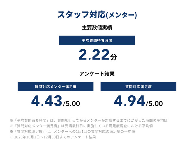 前回(2023年7~9月)に引き続き、サービス全体満足度4.24(最大値5)、質問対応メンター満足度4.43(最大値5)、ライフコーチ満足度4.78(最大値5)、学習完了率86.4%、転職成功率100%と、いずれも高い数値を維持しました。