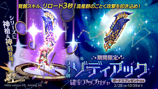 株式会社マーベラス(代表取締役社長:佐藤 澄宣/所在地:東京都品川区)は、スマートフォン向け本格オンラインRPG『剣と魔法のログレス いにしえの女神』において、2024/2/14(水)に「ジョブ別 ゾディアック確率アップガチャ」の販売、および「とろけるショコラ メルティバレンタイン」のクエスト追加を含むアップデートを行ったことをお知らせいたします。