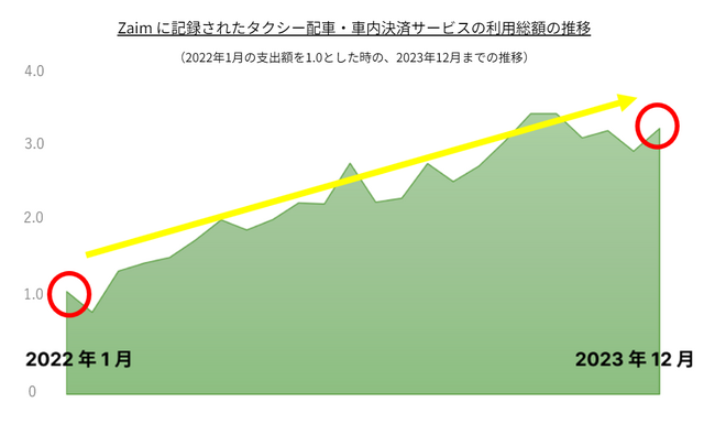 以下はZaim に記録された主要なタクシー配車・車内決済サービスの利用総額推移です。2022 年1 月と 2023 年 12 月の時点を比較すると、タクシー配車・車内決済サービスの利用総額は約 3 倍にまで伸長していることがわかります。移動におけるDX化が定着し、ユーザーの簡便性が高まりつつあるようです。