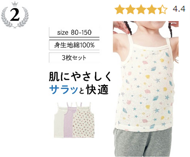 1位と同シリーズのキャミタイプ。肩ひもがずれにくい仕様、前後がわかりやすいリボン使いもポイント。