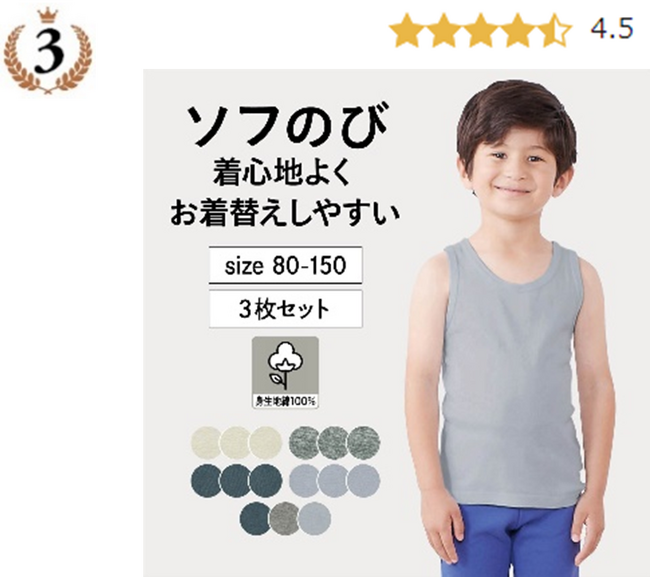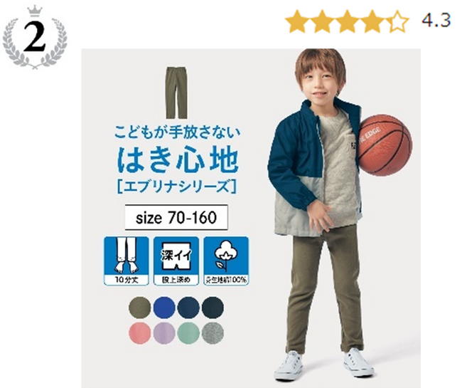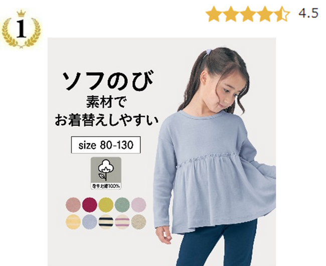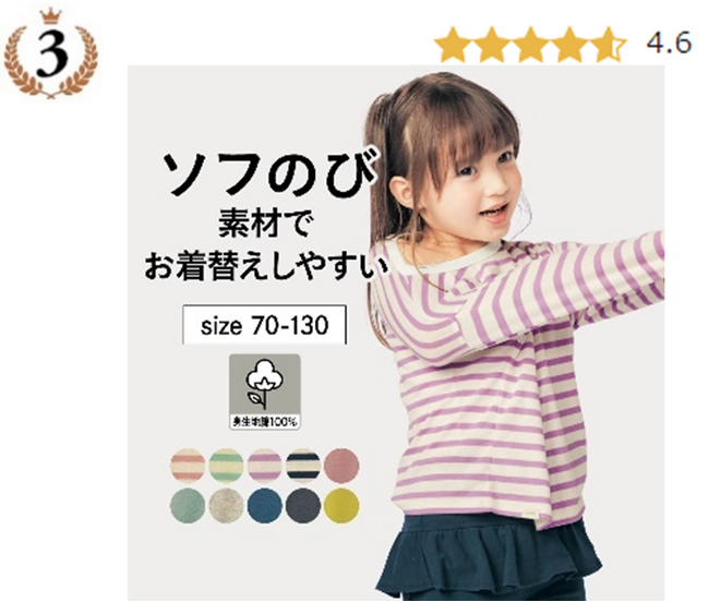 1位と同じソフのびシリーズ。綿100%素材なのに、よく伸びるので、一人でお着替えしやすい!