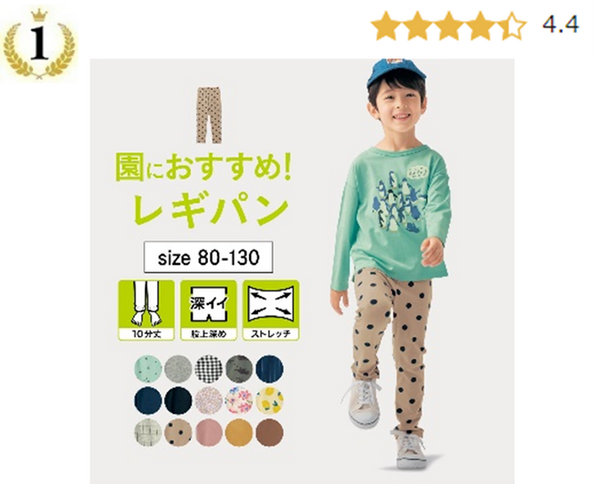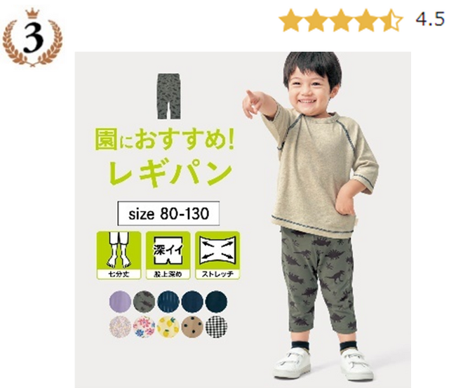 1位と同シリーズの七分丈。夏用の園パンツは、虫刺されやケガから守られるので、七分丈が大活躍します!