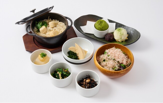「日本橋だし場 はなれ」で多くのお客様が注文するだし炊き込みご飯や伊兵衛サラダ、長芋フライ、だし香るスフレオムレツなどの人気メニューを軸に、本メニューのために開発した「若竹煮」や「抹茶の蒸しケーキ」など、このコースでしか味わえないメニューで展開しています。
