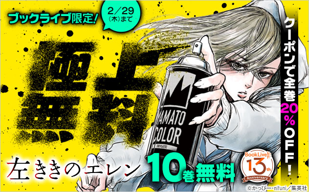 TOPPANホールディングス株式会社のグループ会社である、株式会社BookLive(本社:東京都港区・代表取締役社長:淡野 正)は、運営する総合電子書籍ストア「ブックライブ」にて、サービス開始13周年記念キャンペーンとして、2月16(金)~2月29日(木)期間限定で『左ききのエレン』(原作:かっぴー・漫画:nifuni/集英社)1~10巻を無料配信するとともに、全巻に使える20%OFFでご購入いただける特別クーポンを配布いたします。