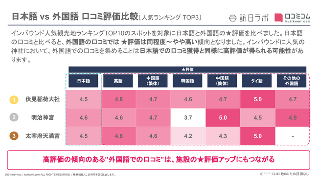 さらに本レポートでは、人気観光地TOP10の口コミ評価を言語別に算出。日本語と外国語との評価を比べてみると、ある特徴が見えてきました。