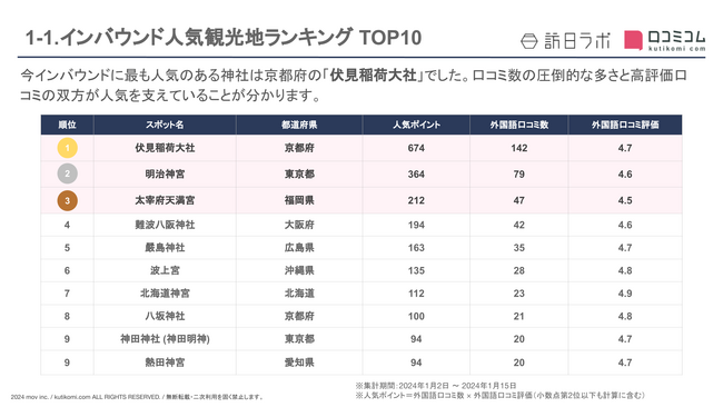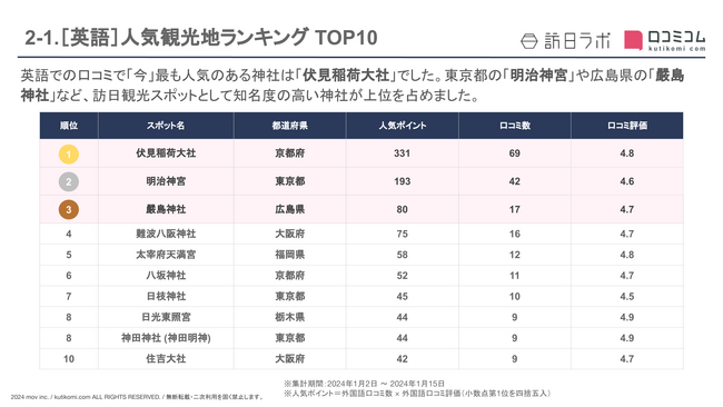 国内最大級のインバウンド総合メディア「訪日ラボ」及び 口コミサイトを”もっと”売上に変える店舗支援SaaS「口コミコム」を運営する株式会社mov(代表取締役:渡邊 誠、本社:東京都渋谷区、以下mov)は、全国の観光スポットに寄せられた最新の口コミデータから、独自の『インバウンド人気観光地ランキング』を発表しました。