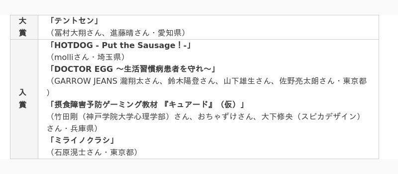選評:日本での死亡者数の6割を占める生活習慣病をテーマに、プレーヤーが医者となり、各病気にあったアドバイスを送り治療するゲームになっています。「ストレス発散」といった複数種類の生活習慣病に効くアドバイスがあるなど、生活習慣病とその予防・対処への理解が深まる点が評価されました。
