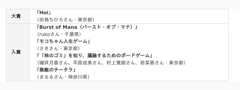 - NPO法人Board Game Japan、アマチュアのボードゲームクリエイターの作品などを表彰するコンテスト「第3回Board Game Japanカップ」を開催11/01 10:00