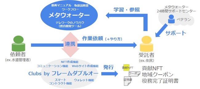本サービスは、DAOを用いて、上下水道インフラを中心に据えた地域コミュニティの組成を支援するもので、フレームダブルオー社の「Clubs」と当社独自のリモートワーク用ツールを連携させることで実現します。