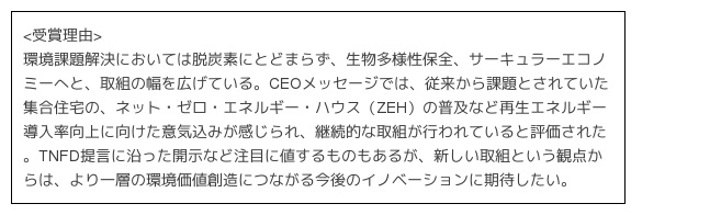 積水ハウス、「ESGファイナンス・アワード・ジャパン」において環境サステナブル企業部門の銅賞を受賞