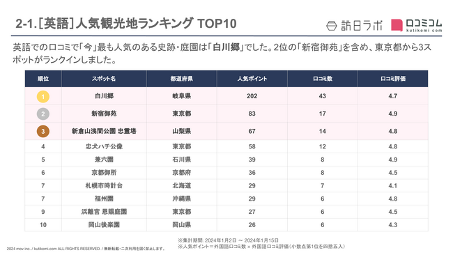 英語での口コミで「今」最も人気のある観光スポットは「白川郷」でした。★評価は4.7であり、顧客満足度の高さがうかがえます。