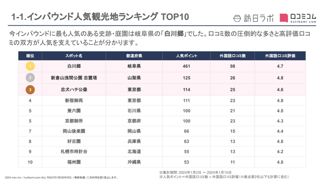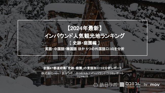 国内最大級のインバウンド総合メディア「訪日ラボ」及び 口コミサイトを”もっと”売上に変える店舗支援SaaS「口コミコム」を運営する株式会社mov(代表取締役:渡邊 誠、本社:東京都渋谷区、以下mov)は、全国の観光スポットに寄せられた最新の口コミデータから、独自の『インバウンド人気観光地ランキング』を発表しました。