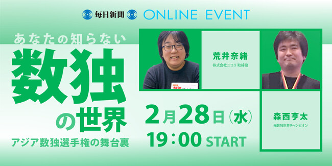 毎日新聞社(代表取締役社長:松木健)は2月28日(水)午後7時からオンラインイベント「あなたの知らない数独の世界ーアジア数独選手権の舞台裏ー」を開催します。1月28日に「アジア数独選手権2024」が開催されました。数独の国際大会が日本で開催されたのは初めてです。その舞台裏、数独の解き方のコツについて、世界選手権で優勝経験もある森西亨太さん、数独などのパズル制作で知られる(株)ニコリの荒井奈緒さんが語ります。ぜひご参加ください。