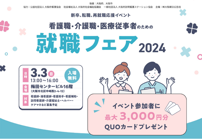 株式会社大阪朝日広告社(所在地:大阪府大阪市中央区)は、『看護職・介護職・医療従事者のための就職フェア』と題した就職イベントを3月3日(日)に大阪の梅田センタービルで開催します。