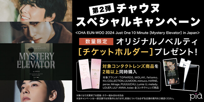 PIA株式会社のコンタクトレンズ商品を2箱以上同時に購入してくださった方へ、<CHA EUN-WOO 2024 Just One 10 Minute [Mystery Elevator] in Japan>オリジナルチケットホルダーをプレゼントします。