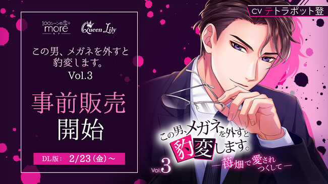 株式会社ボルテージ(本社:東京都渋谷区 代表取締役:津谷 祐司)は、シチュエーションドラマCDレーベル「Queen Lily」の最新作「この男、メガネを外すと豹変します。Vol.3 ~苺畑で愛されつくして~」 (CV.テトラポット登)のダウンロード版が2月23日(金)より事前販売を開始したことをお知らせいたします。
