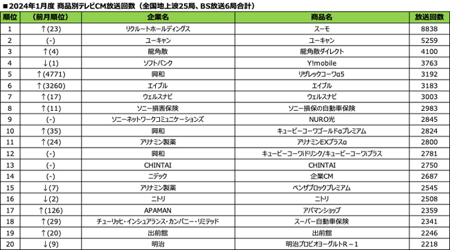 2024年1月度 商品別テレビCM放送回数ランキング