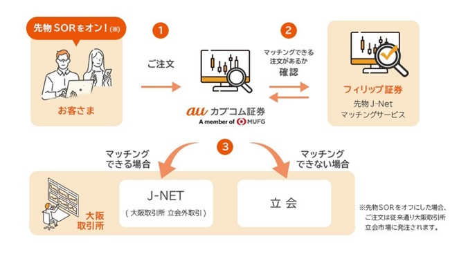 「先物SOR(エスオーアール)取引」とは、フィリップ証券が提供する「先物J-Netマッチングサービス」にて機関投資家から取引所最良気配価格以内で流動性の提供を受け、auカブコム証券のお客さまのご注文が取引所最良気配価格と同値または有利な価格で約定できる場合のみマッチングを行い、大阪取引所の立会外取引(J-NET取引)にて約定する取引です。