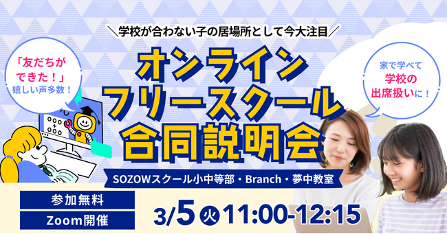 ITツールの活用によって都市部から過疎地・離島まで全国の子どもに学びの機会を届けているオンラインフリースクールによる合同説明会を、3月5日(火)にオンラインで保護者向けに開催します。(主催:SOZOW株式会社、協力:NPO法人全国不登校新聞社)