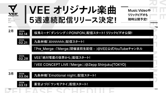 現在合計25名のバーチャルタレントが活動中であり、本日2月28日には初の大規模オフライン音楽イベント「VEE CONCEPT LIVE『Merge』」をZepp Shinjuku(TOKYO)にて開催します。