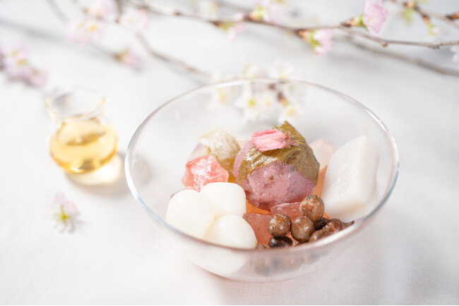 可愛いだけじゃない、上品な桜づくしの「桜白玉あんみつ」は口に入れた瞬間に桜のやさしい香りがふわっと広がります。お花見のお供にもぴったりの商品です。