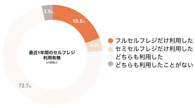 直近1年間で、セルフレジを利用したことがあるかを尋ねたところ、19.5%が「フルセルフレジだけ利用した」、4.2%が「セミセルフレジだけ利用した」、72.7%が「どちらも利用した」と9割超が利用経験者。「どちらも利用したことがない」の3.5%を大きく上回り、普及が進んでいる実態が明らかとなりました。