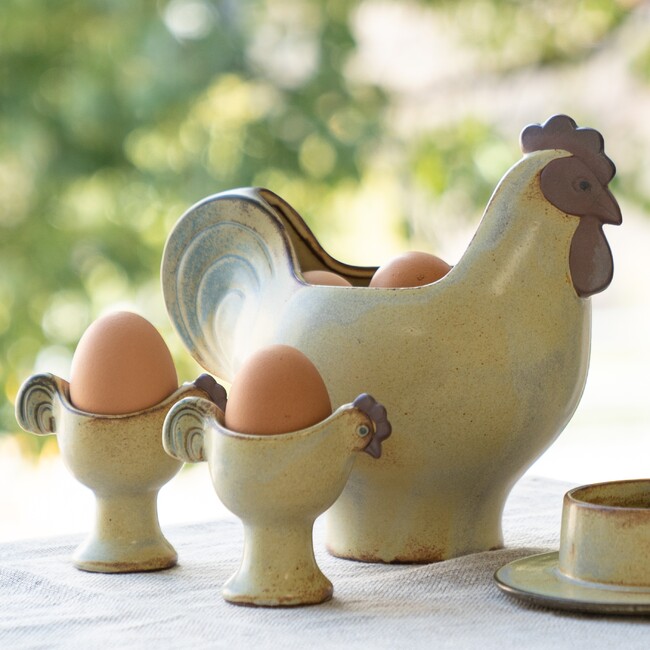 にわとりのエッグカップ、バターケースが、オリジナルと同様の手法で復刻されています。