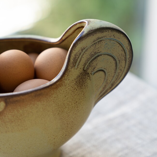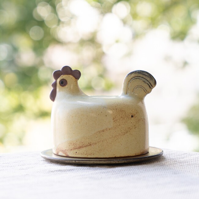 蓋を開けた瞬間にまわりから声が出そうな、めんどりがひなを暖めているようにも見えるバターケースです。クッキーやデザートを入れても、小物入れに使っても素敵です。