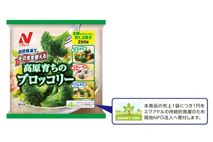 このたび、エクアドル産冷凍ブロッコリーの持続的な調達と地域社会貢献のため、『そのまま使える 高原育ち(R)のブロッコリー』の「売上1袋につき1円」を、プロベフルーツを通じて、現地NPO法人に寄付いたします。なお、本取り組みは、エクアドル大使館の後援を受けており、今後も継続を予定しています。