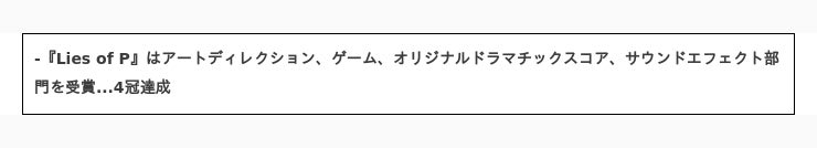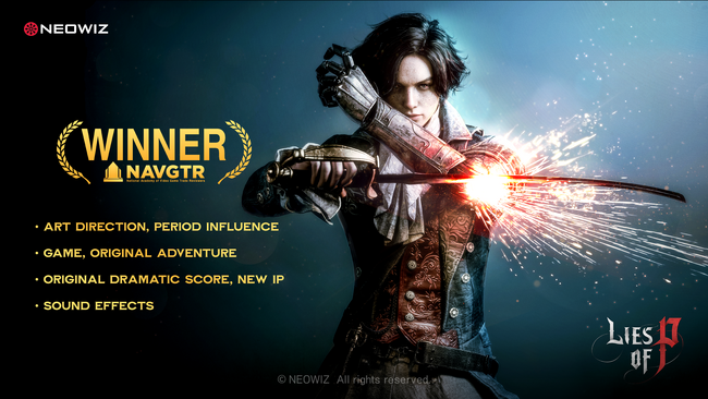 株式会社NEOWIZ (本社:韓国 京畿道城南市、共同代表:金 承徹(キム・スンチョル)/裵 泰根(ベ・テグン)) は2023年9月19日(月)に発売いたしましたソウルライクアクションRPG『Lies of P』におきまして、NAVGTR(The National Academy of Video Game Trade Reviewers)で4部門受賞の栄誉を獲得いたしました。